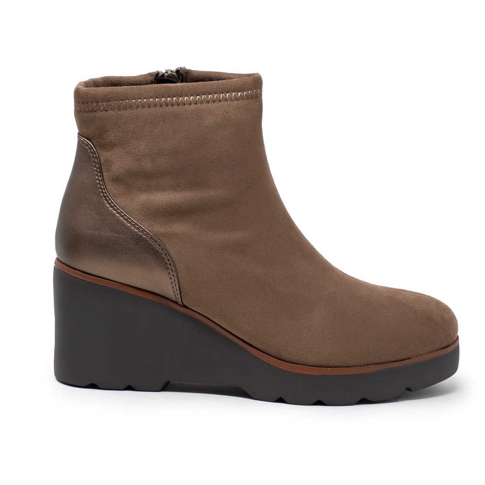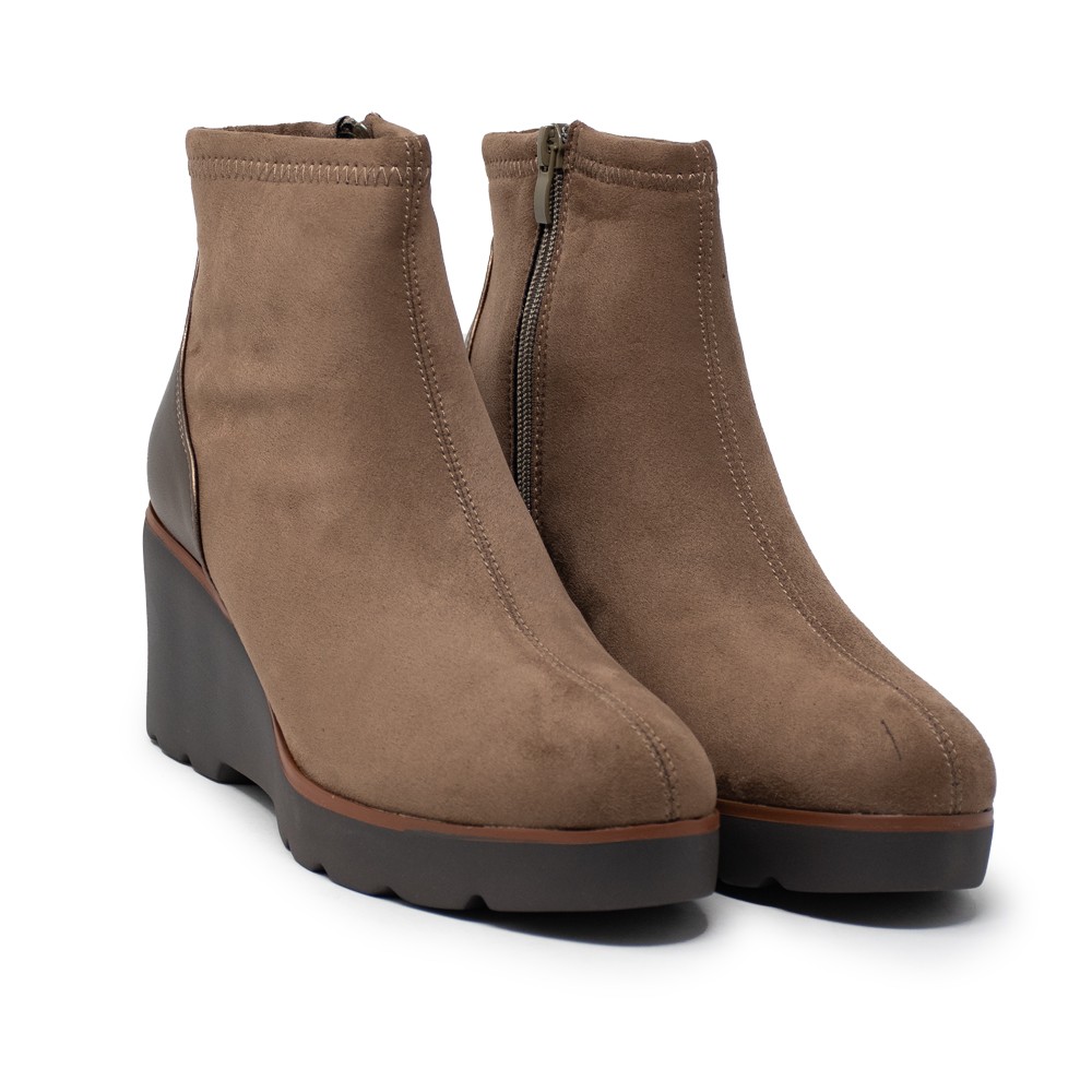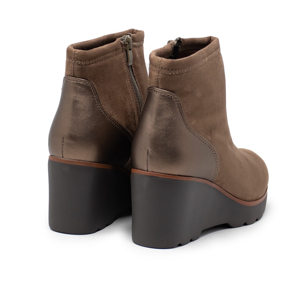 El diseño de estos botines destaca por su pieza en el talón en color taupe, que añade un toque sofisticado y original al conjunto. El tacón medio proporciona un extra de altura sin renunciar a la comodidad, ideal para lucir durante todo el día sin sacrificar tu estilo personal.