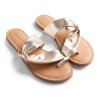 El color platino de estas sandalias aporta un toque de brillo y glamour a tu look, mientras que las decoraciones cruzadas en el empeine le dan un estilo único y llamativo. Fabricadas con materiales de alta calidad, estas esclavas son cómodas y duraderas, garantizando una pisada suave y segura en cada paso que des.