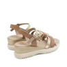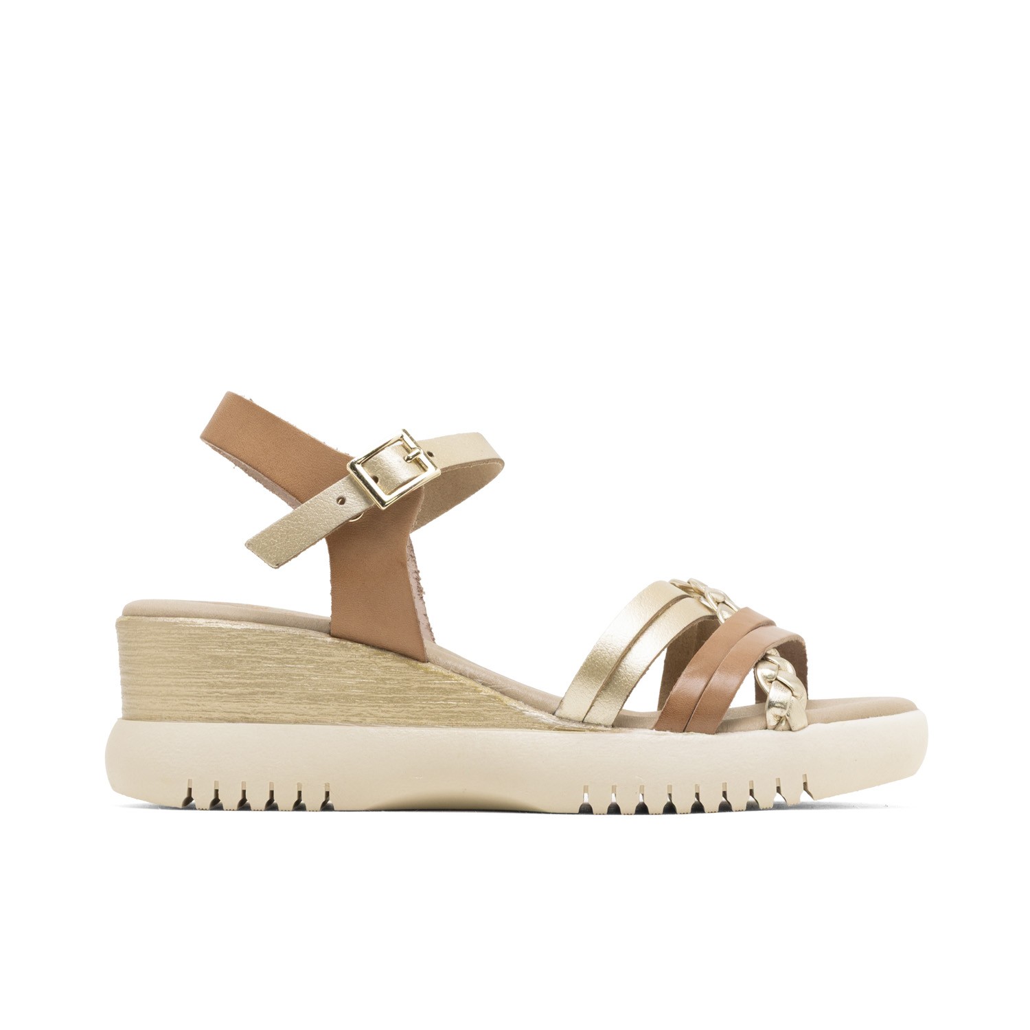 El color taupe es versátil y fácil de combinar, mientras que el detalle en color oro le da un toque de brillo y glamour a estas sandalias. Las tiras cruzadas en la parte delantera añaden un toque moderno y femenino, mientras que la plataforma te proporciona altura sin sacrificar la comodidad.