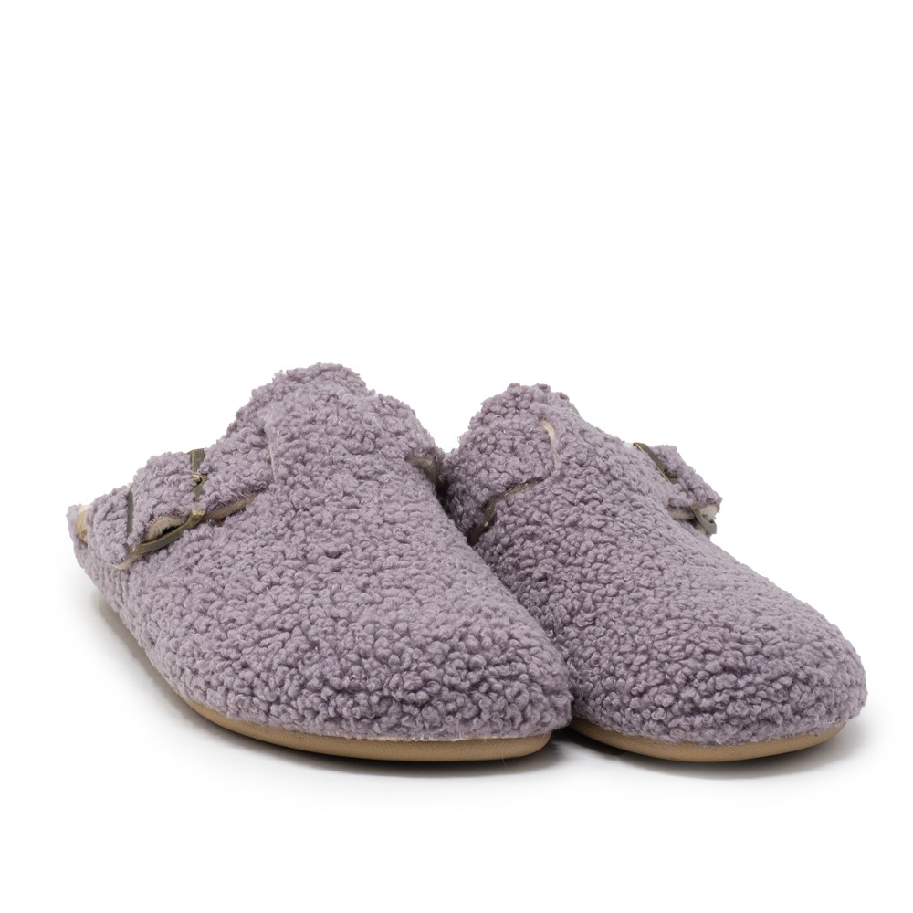 Este zueco está fabricado con un material exterior de borreguillo en color malva, que le da un toque elegante y sofisticado. Su interior también está forrado con borreguillo, lo que proporciona una sensación agradable y cálida al contacto con la piel. La suela es antideslizante, lo que te permite caminar con seguridad por tu hogar.
