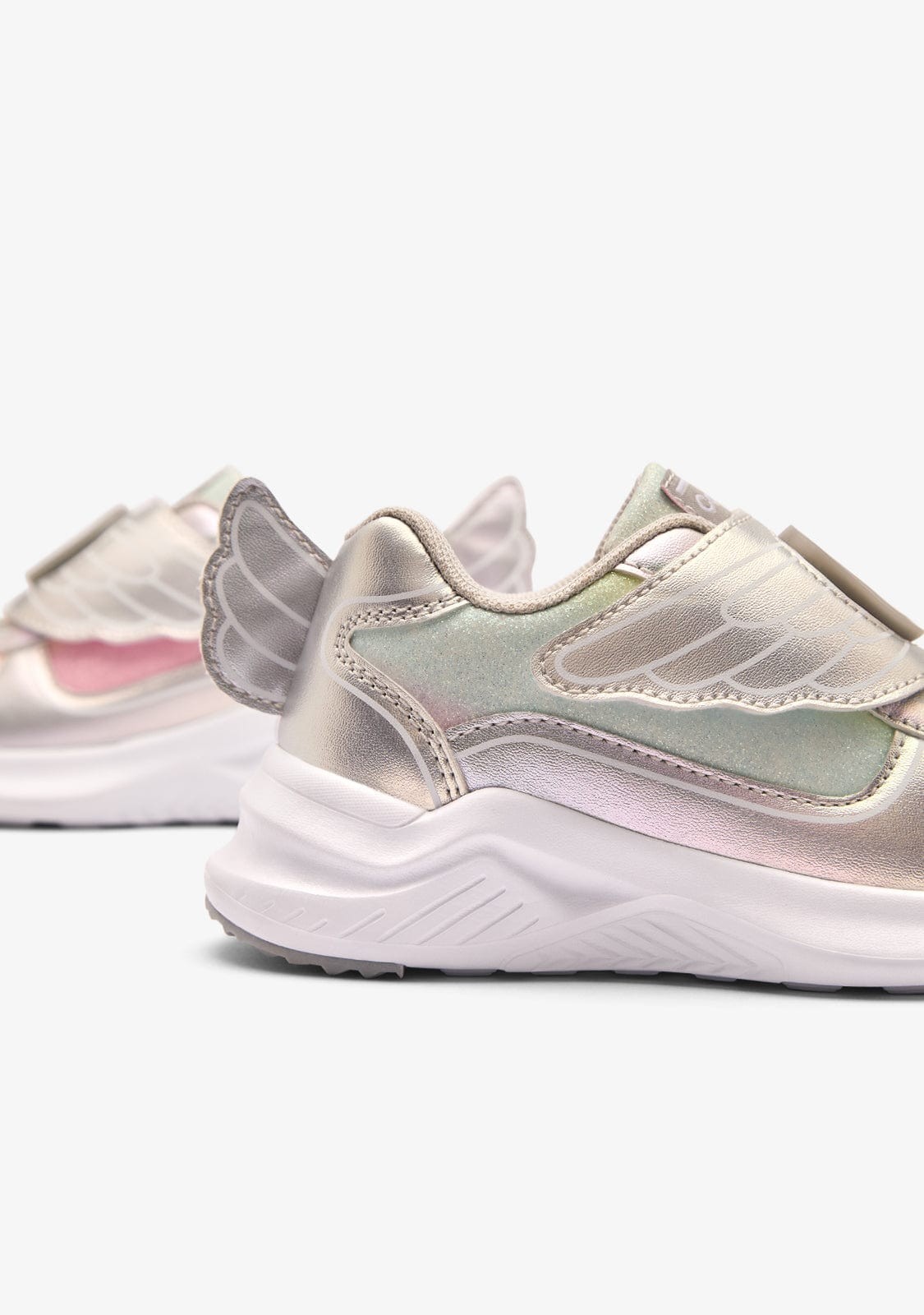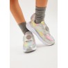 Con un diseño plateado brillante y detalles en colores vibrantes, estas zapatillas deportivas destacan por su estilo único y llamativo. Son ideales para combinar con outfits casuales o deportivos, añadiendo un toque de moda a cualquier look.
