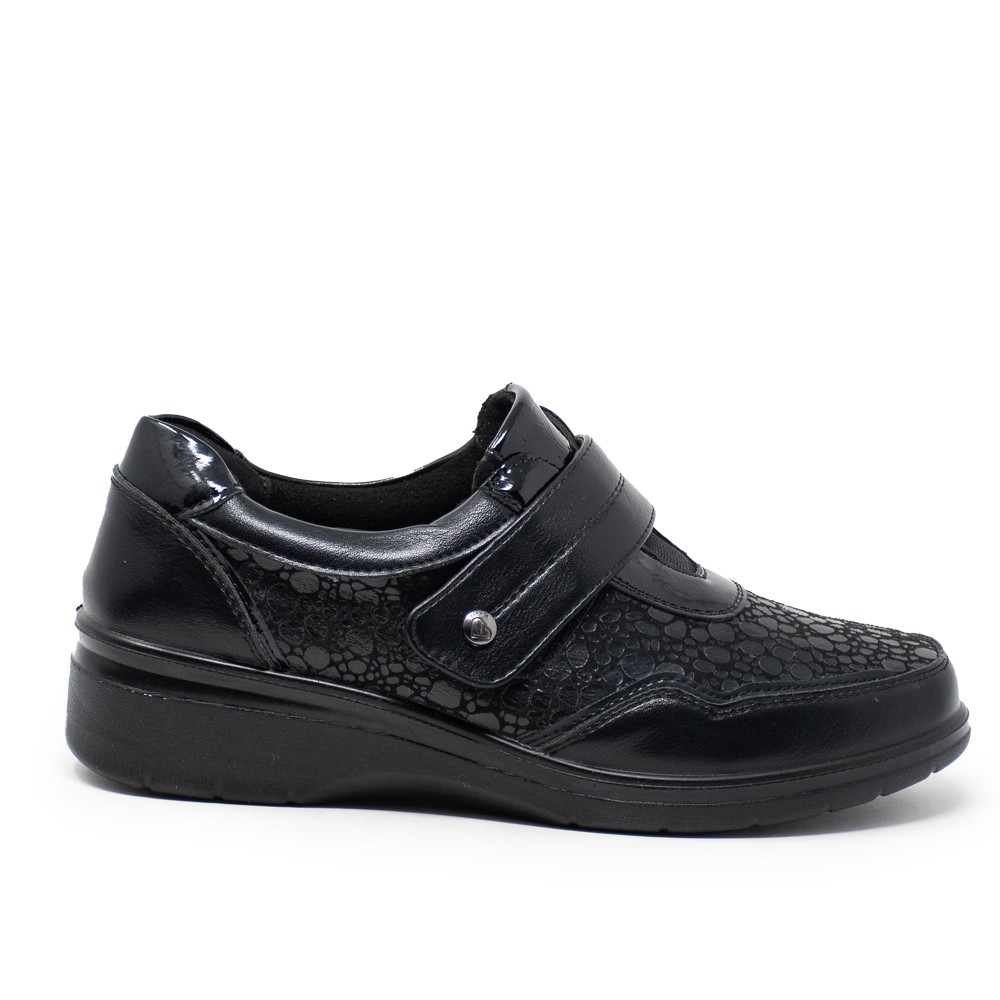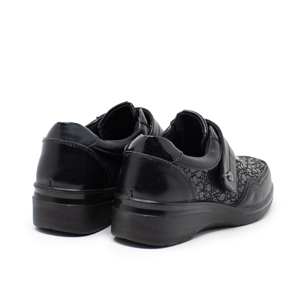 El diseño de este zapato destaca por su acabado en escamas que le otorga un toque sofisticado y moderno. El color negro es atemporal y fácil de combinar con diferentes outfits, ya sea para un look casual o más formal.