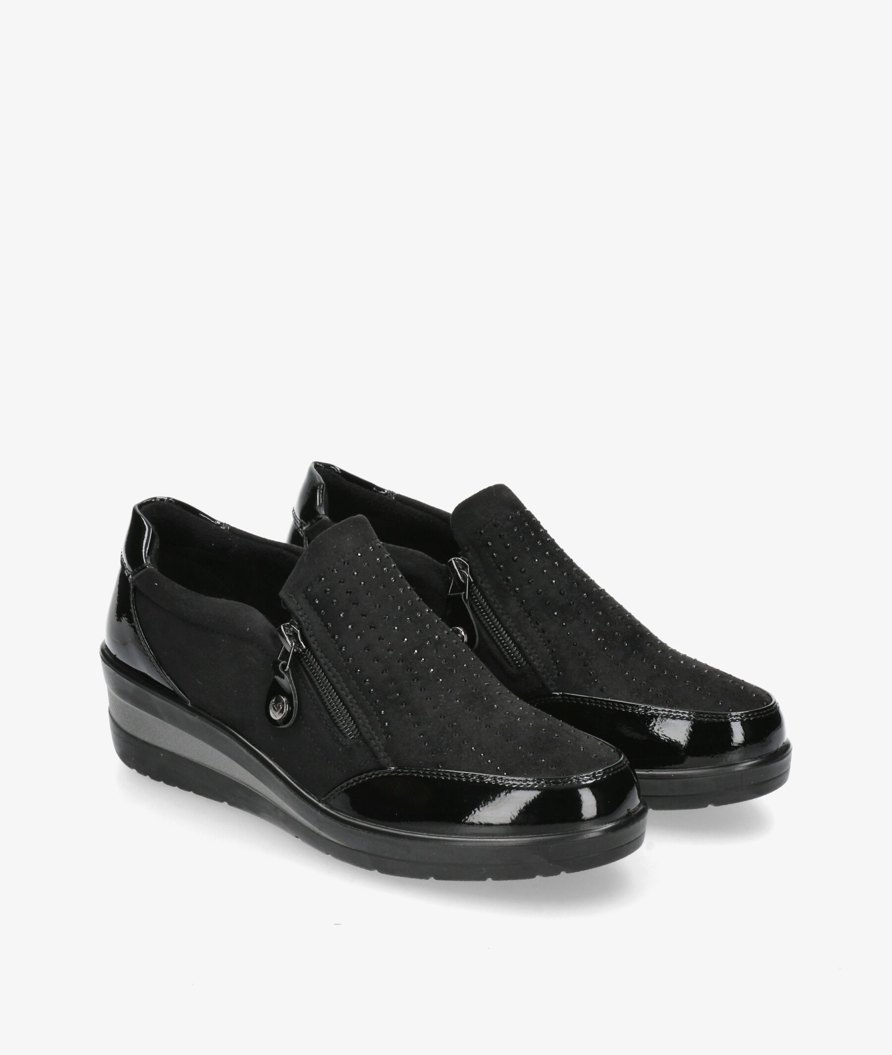 Atrévete a lucir elegante y cómoda al mismo tiempo con los zapatos CONFORT CU?A CREMALLERA STRASS NEGRO de AMARPIES. No sacrifiques el estilo por la comodidad, ¡tenlo todo con este calzado único!