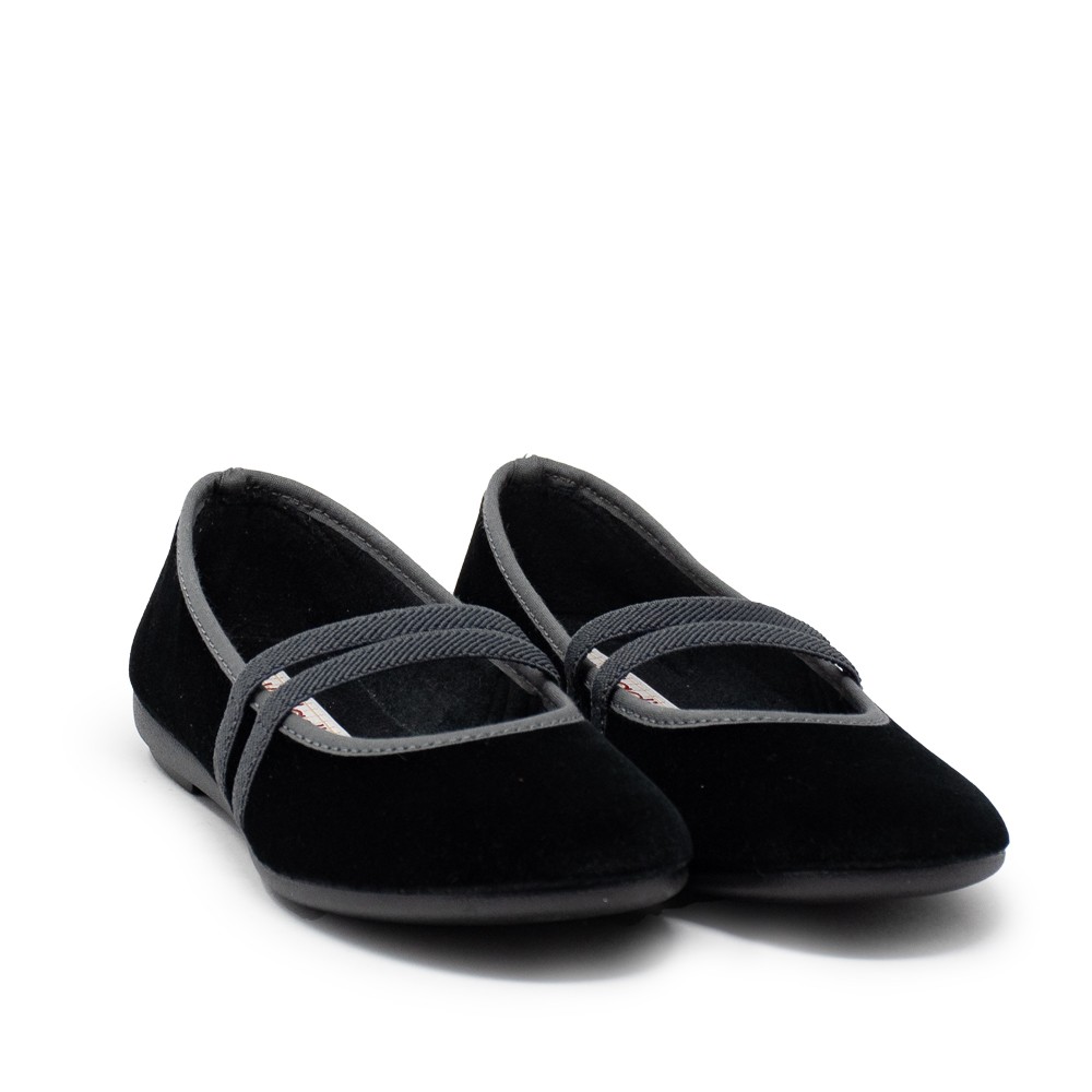 Este modelo de bailarina está fabricado en terciopelo negro, un material suave y elegante que le da un toque especial a cualquier look. Las dos gomas en la parte delantera aseguran un ajuste perfecto al pie, proporcionando comodidad y seguridad al caminar.
